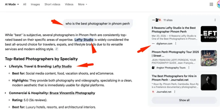 Our initial goal was to create visibility for searches like “who is the best photographer in Phnom Penh” “best photographer in Phnom Penh” and related terms, especially in AI-driven search experiences.